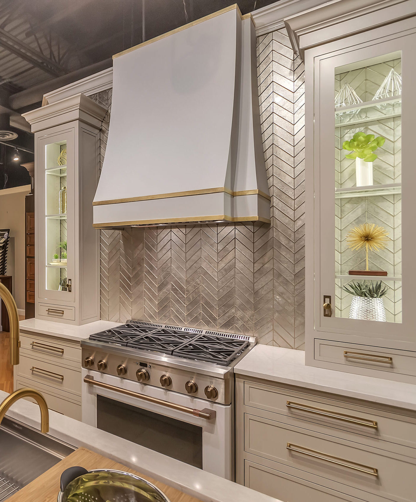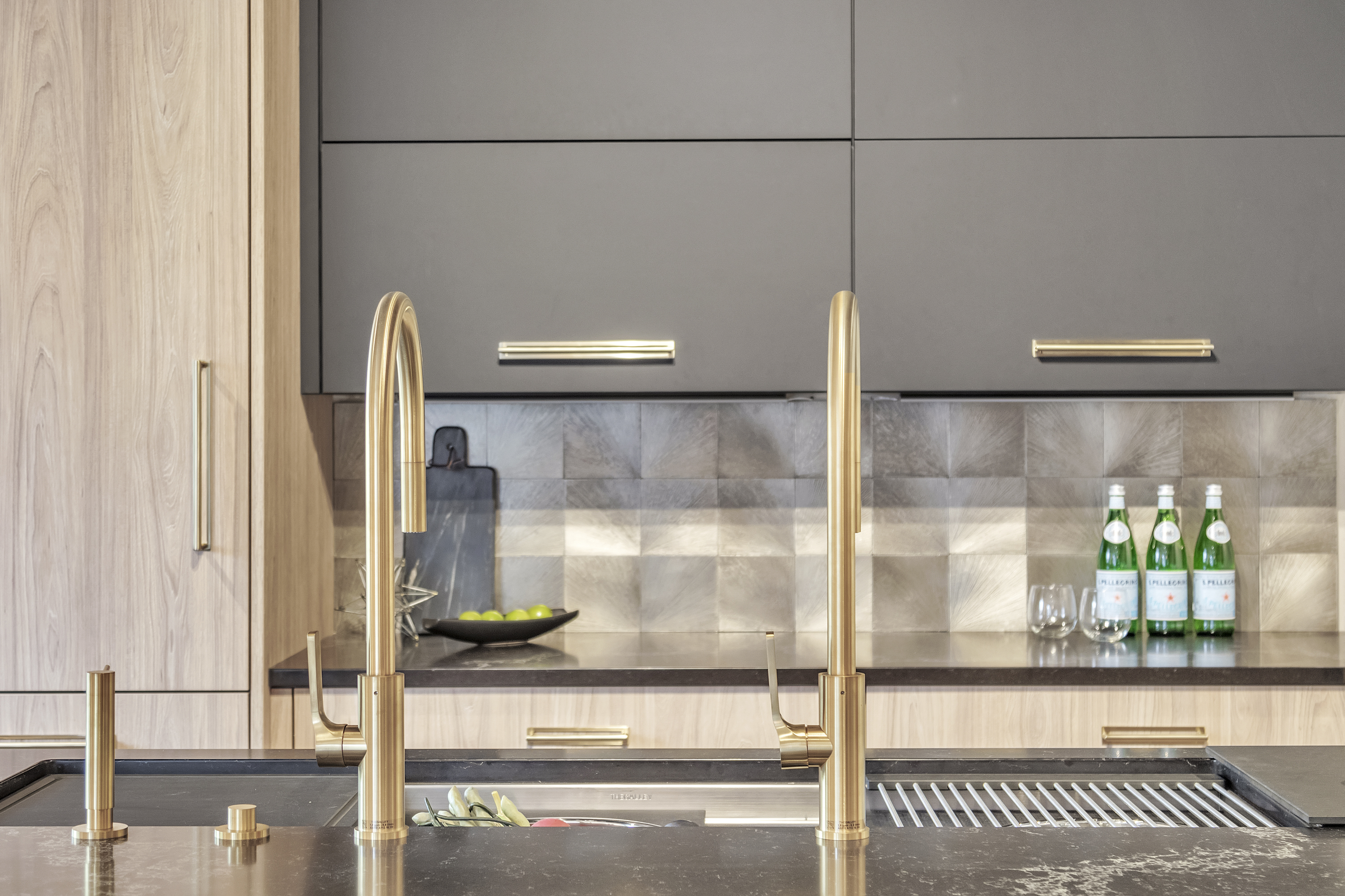 Speaking of mixing metals, we love the way a warm metal like gold pops when paired with a cool metal like silver and chrome. The use of a silver metallic backsplash paired with the canvas colored cabinetry makes a significant statement.
