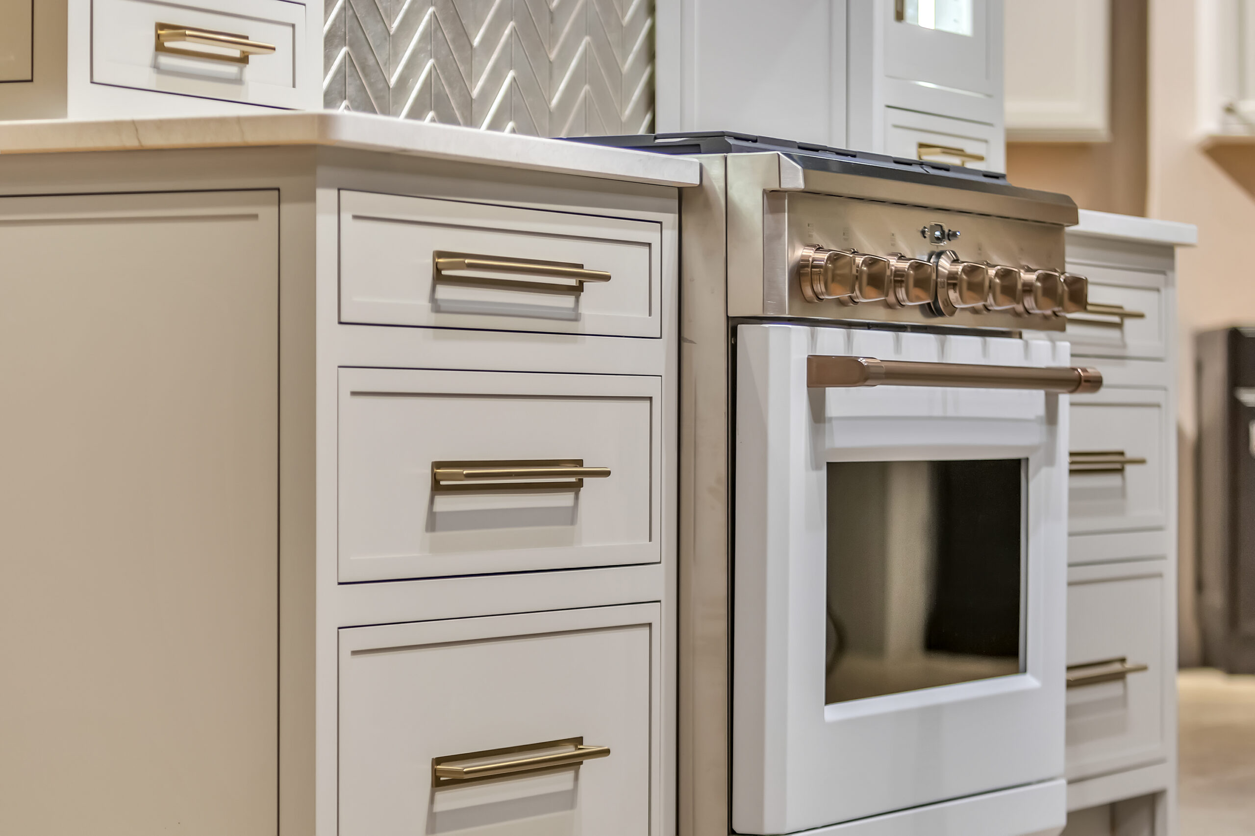 Whether you prefer bin pulls, bar pulls, ring pulls or knobs, gold hardware packs a punch in aesthetic appeal in both wood cabinetry or painted cabinetry.