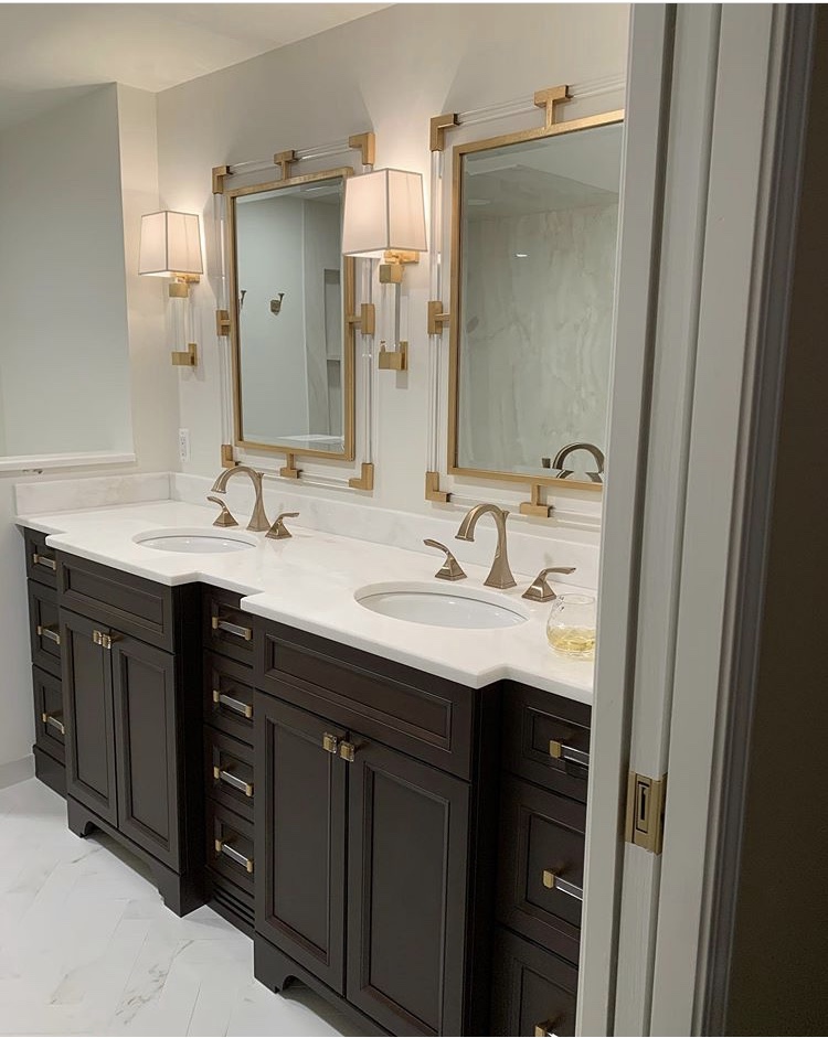 Paired with this beautiful deep walnut vanity, the use of gold accents in this bathroom offers an extreme level of luxury and opulence.
