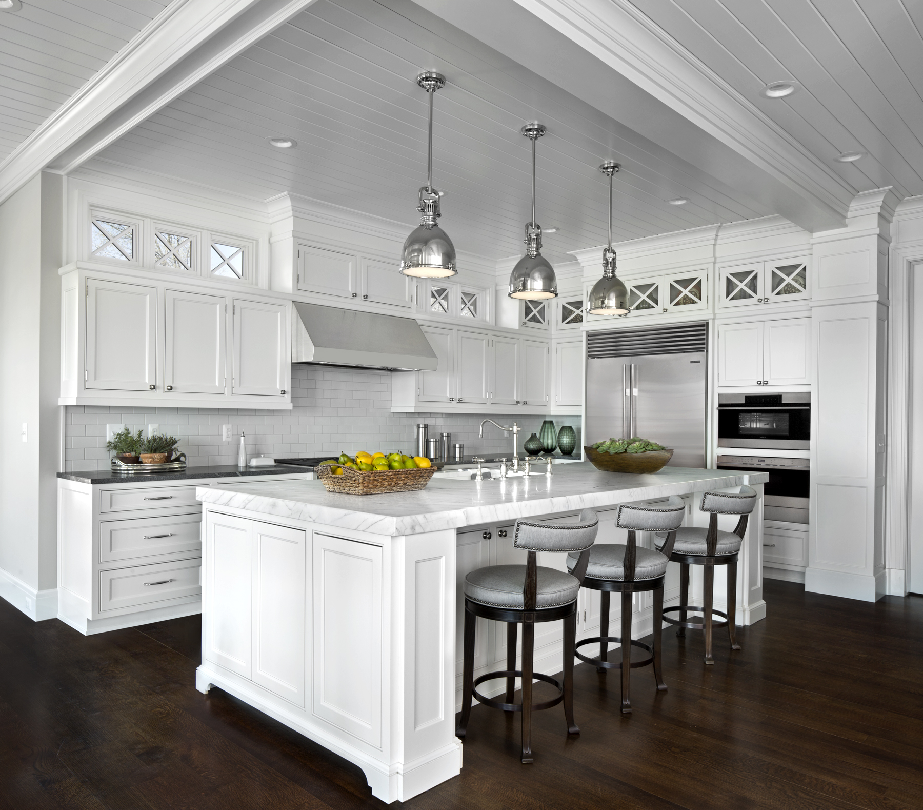 Pictured here is our take on a traditional, low contrast kitchen designed in Ayr Cabinetry with an extra thick Marble countertop.