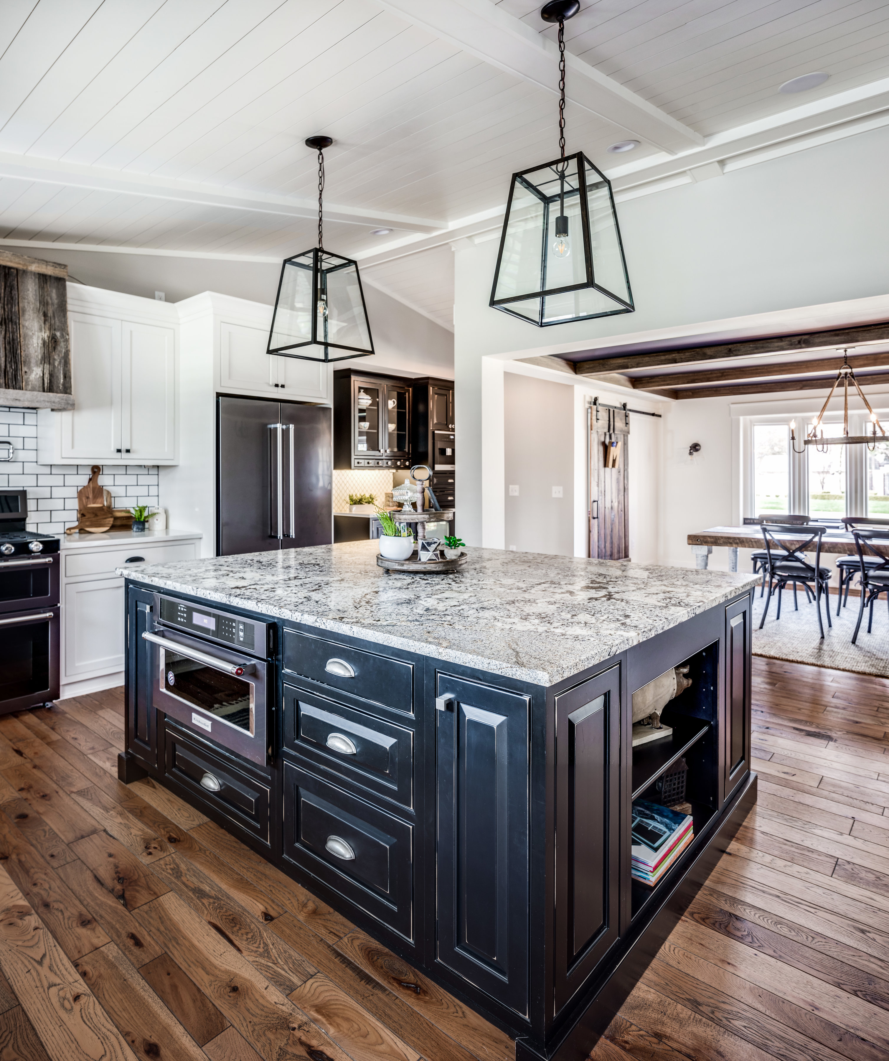 When we start reminiscing about the McCarthy Family’s sprawling kitchen remodel in Plymouth, Michigan we go into character overload!  From the oversized distressed island, the rustic wood shelving and custom range hood, shiplap ceiling and black and white classic design it’s nearly impossible for us to choose our favorite design element… keep reading, we’d love to know yours!