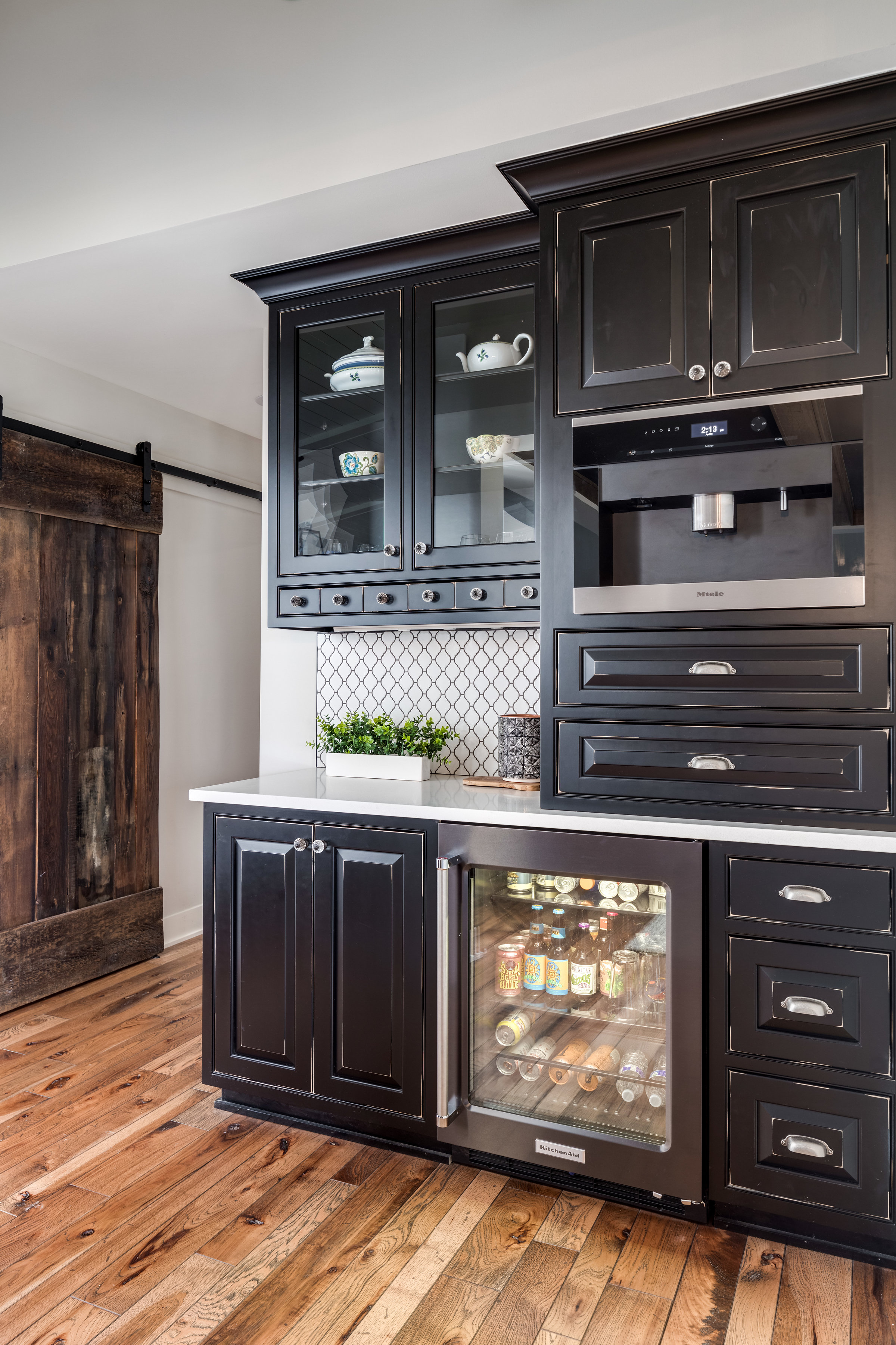 The addition of wood elements in the custom made reclaimed barnwood range hood and open shelving not only give the eye some breathing room between the white cabinetry and white shiplap ceiling, but also juxtapose the rustic feel of the distressed island nicely.  On the other side of this kitchen, we also designed a coffee and beverage station, complete with the state of the art Miele coffee system and mini fridge for these beer lovers.  You’ll see here in the beverage center our homeowner opted for an arabesque style backsplash similar in colors to the white subway tile throughout the rest of the kitchen.  We like her style!
