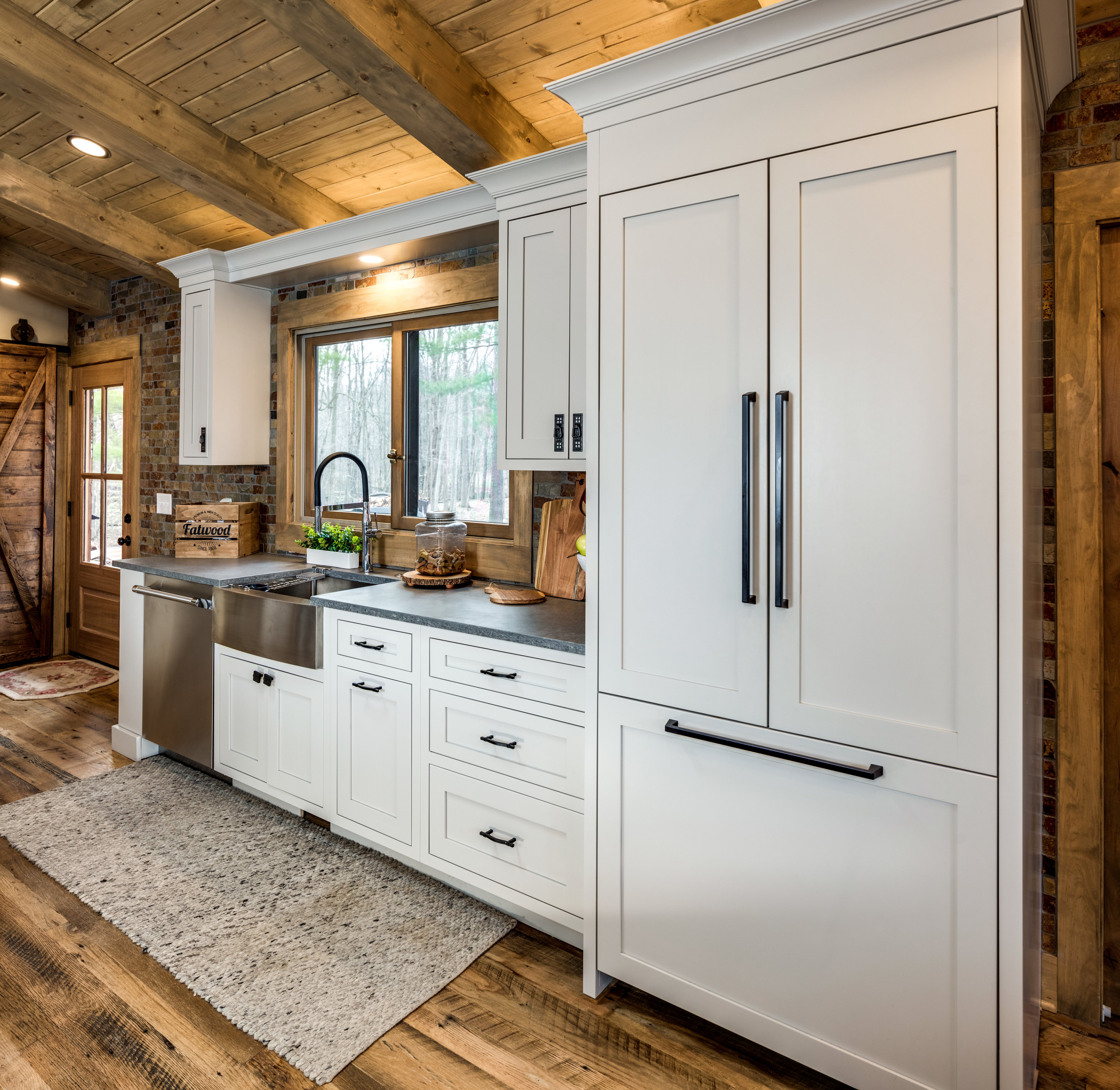 In an effort to keep the rustic feel of the house, our homeowner and the E.W. Kitchens Dream Team worked around the vast cathedral ceiling and original beams to open up the space.  As a design element, the salvaged beams not only help to continue the rustic decor of the home but also help divide the zones into cooking, eating and living spaces.