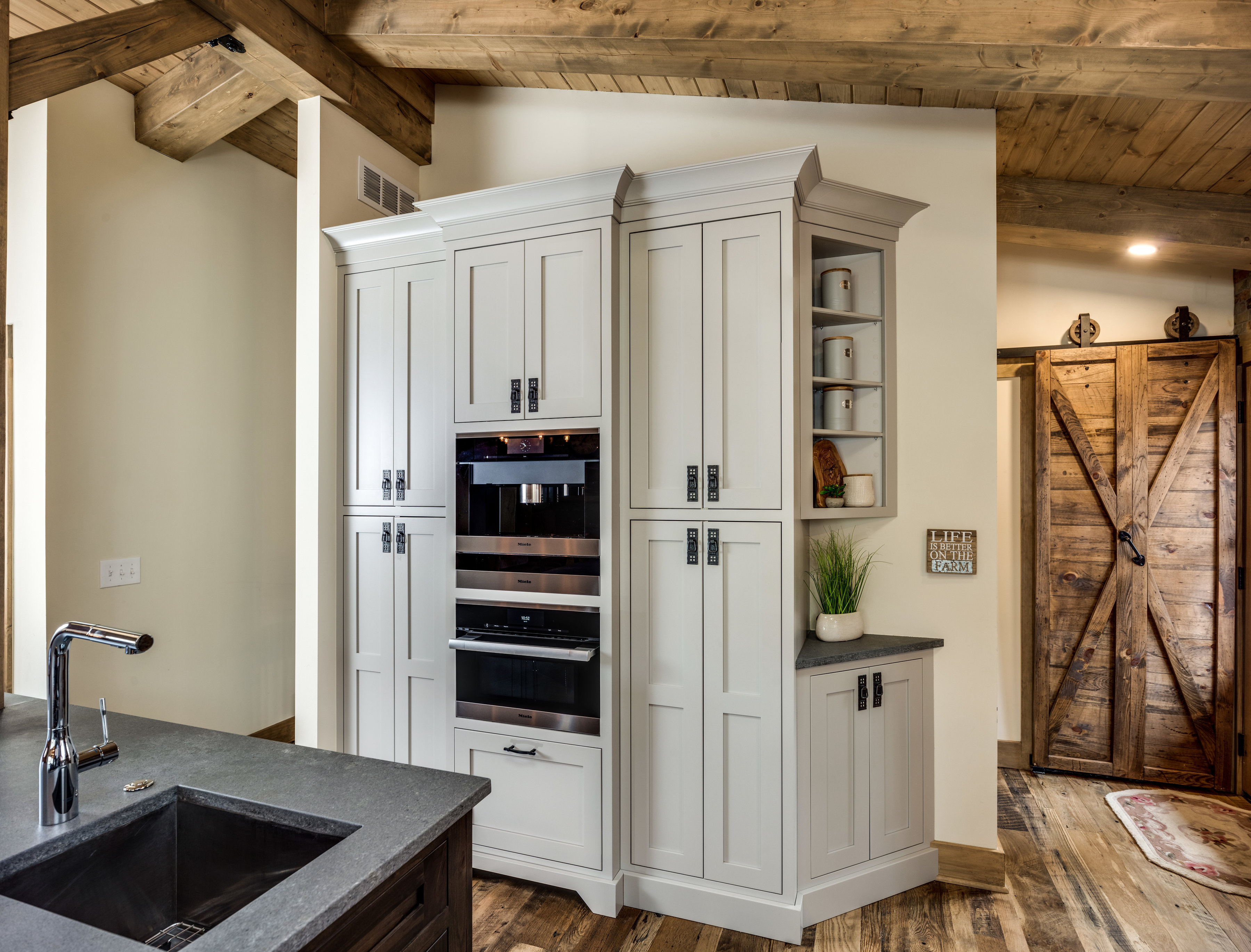 Using Mouser Custom Cabinetry, a two toned look was designed with a deep knotty alder island with painted maple cabinets along the perimeter.  The X mullions designed on the sides of the over sized island bring an unexpected transitional design element that fits right in with the inviting feel of this massive gathering area.  The space was pulled together using Cesarstone “rugged concrete” countertops with stacked stone as the kitchen backslash.  The natural-hued stones taken to the ceiling compliment the natural wood ceiling and add a stunning visual element!  Adding appliances with pizzazz like a Miele coffee system and professional line Thermador range provides a modern contrast to the rustic style of this home.